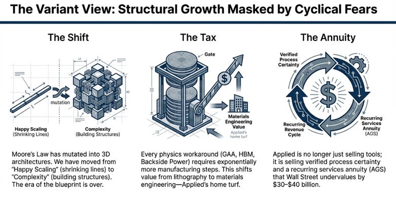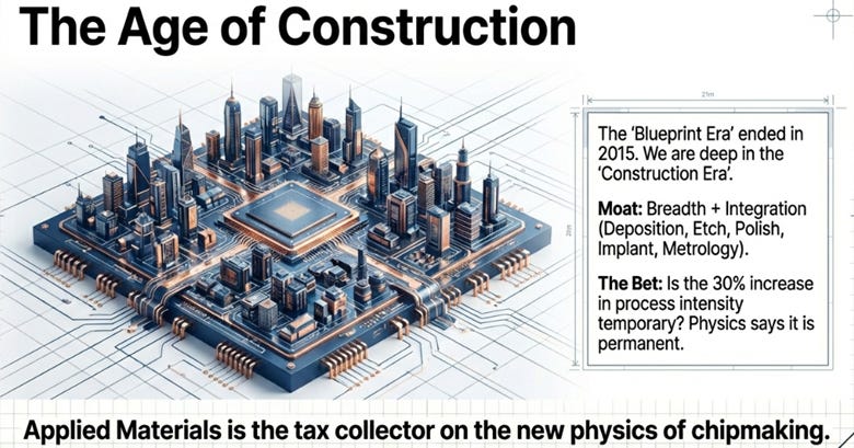 Wall Street understands the near-term story: AI is driving equipment demand, and Applied is benefiting. What the market is mispricing is duration. The consensus sees a strong 2025-2027, then expects reversion. The reality is that the complexity tax doesn’t cycle, it accumulates. Every fab going forward will be more equipment-intensive than the last.