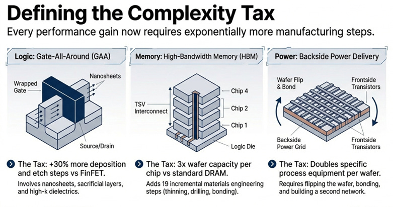 The bottleneck moved from the blueprint to the construction, and the construction phase is vastly more complex. Gate-All-Around requires 30% more materials engineering steps. High-Bandwidth Memory requires three times the wafer capacity per chip. Backside power delivery adds an entirely new dimension to manufacturing. These aren’t one-time upgrades. They’re the new baseline.