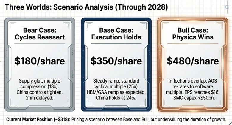 This world requires TSMC capital expenditure staying above $50 billion through 2027, HBM TAM exceeding $110 billion by 2028, and Applied’s backlog remaining above $17 billion. The signals would be unmistakable: gross margin holding above 49%, AGS growing 10%+ regardless of what Systems does, and customers pulling tools forward rather than delaying them.