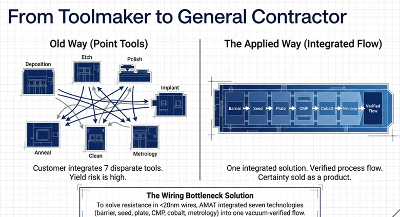 A concrete example: The wiring bottleneck. As copper interconnects shrank below 20 nanometers, resistance spiked and reliability collapsed. Applied developed a solution that integrated seven different technologies, barrier deposition, copper seed layer deposition, electroplating, chemical-mechanical polishing, selective cobalt fill for the smallest wires, and real-time metrology, into a verified flow. Customers don’t buy seven tools and integrate them; they adopt Applied’s integrated solution, which delivers known-good results with faster time-to-yield.