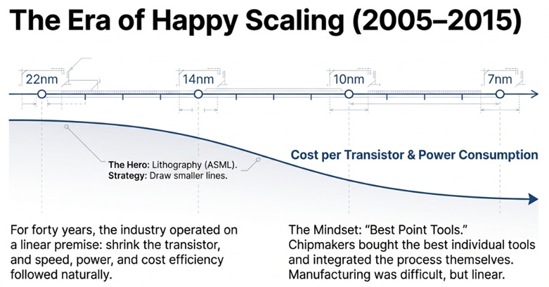 Return to the story that opened this piece. In the happy scaling era, chipmakers won by printing smaller lines. The hero was lithography, and equipment suppliers were supporting actors.