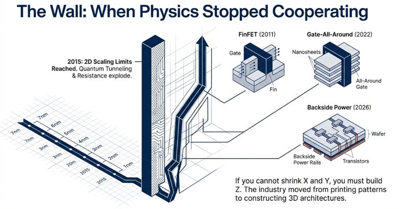 Every major technology transition in semiconductors since 2015 can be understood as a solution to a physics problem, and each solution carries what might be called a complexity tax.