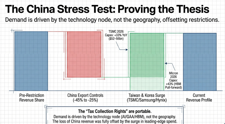 But the export controls did something unexpected: they proved the thesis. When China revenue fell from 45% to 25%, Taiwan and Korea’s combined share rose from 25% to 35%, in a single year.