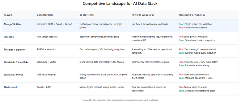 The question isn’t whether the problem exists—hybrid retrieval over governed, live data is real and urgent. The question is whether MongoDB’s integrated solution proves so compelling that enterprises pay a premium for it, or whether “good enough” alternatives and hyperscaler bundling compress its economic opportunity.