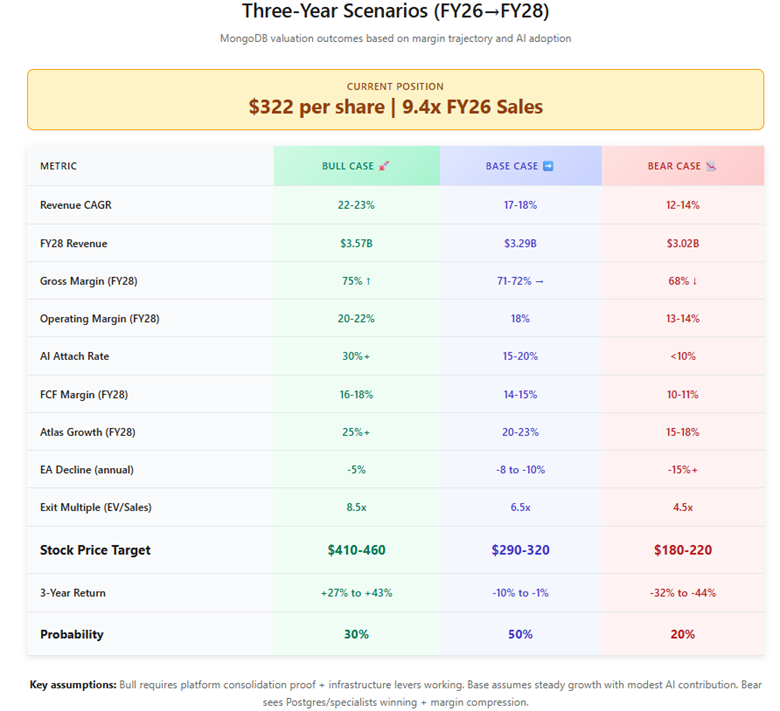 Three scenarios capture MongoDB’s potential paths over the next three years to fiscal 2028.